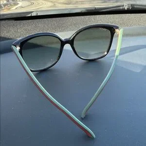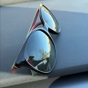 Chic Gucci sunglasses with a glossy black frame and pink accents. Ideal for stylish outings.