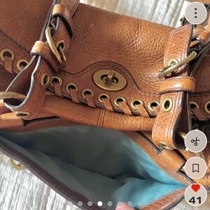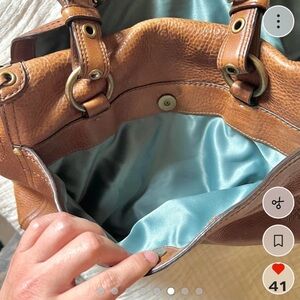 Rich brown leather with brass rivets. Bag is in excellent, preloved condition. There is an ink mark on the bottom of the bag (see photo) that I have worked to lighten since photos were taken. Will probably come out with magic eraser, but I don’t want to risk anything since I am not keeping the bag. I am working on downsizing my collection.
