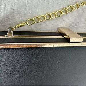 CARA New York Black Gold Trim Hard Case Clutch or Crossbody. In good preowned condition some scratching and tarnishing on the gold trim. Gold chain is not original and is a slightly different color.