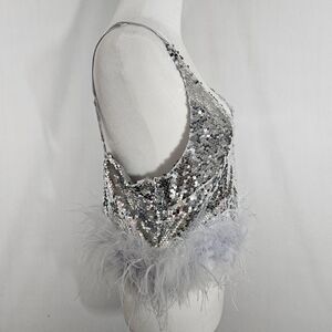 Sexy V-Neckline sleeveless crop top. Sequins with soft lining. Feathers around the hem. Adjutable straps. Various sizes.