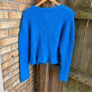 Bright blue cardigan with a cozy texture. Features button closure and front pockets. Ideal for layering.