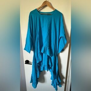 This fun and flowy turquoise top features stylish ruffles, longer sides, and a high low style. Its vibrant color adds a pop to your wardrobe. Definitely a unique boho style top that will catch the eye. There are no tags on this top but it was sold to me as an XL, just be sure to check measurements. It has an oversized, loose fit. Not positive on fabric type, but it feels very much like linen. A very cute top! It is in very good gently used condition from a non-smoking home.