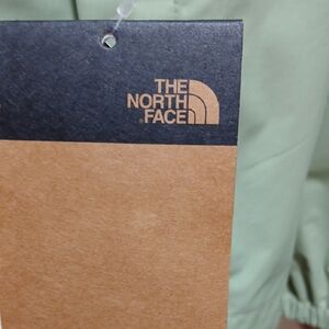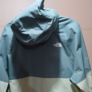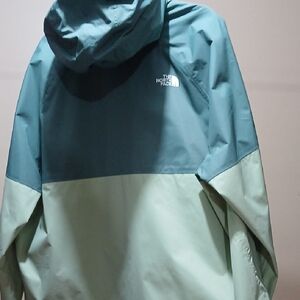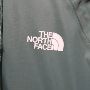 Stylish nylon hoodie by The North Face. Features a comfortable fit and durable two-toned green design with The North Face logo on the front and back of the jacket. This jacket is great for keeping dry in any climate. Brand new, with tags.