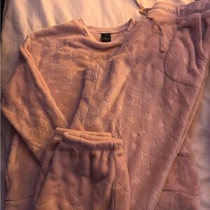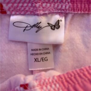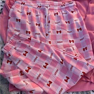 Adorable pink pajama set with festive Holly Dolly design. Cozy top and matching pants. Perfect for holiday nights. dolly parton!! it’s a sweatsuit set!