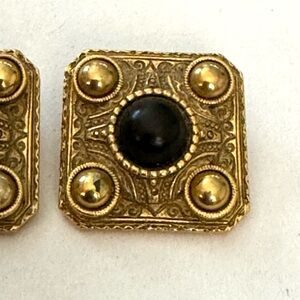 VINTAGE ETRUSCAN Earrings 1” Square Gold Tone repousse Black onyx neoclassical