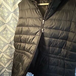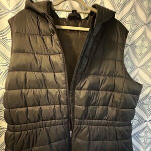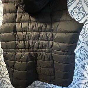 Sleek black quilted vest. Ideal for layering. Features a cozy hood.
