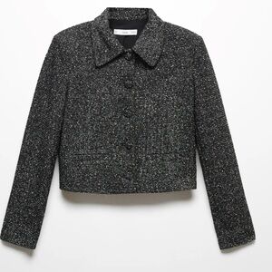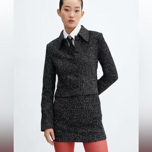 Tweed fabric. (JACKET) Straight design. Short design. Speckled print. Shirt Collar. Long sleeves. Total look. Front button closure.