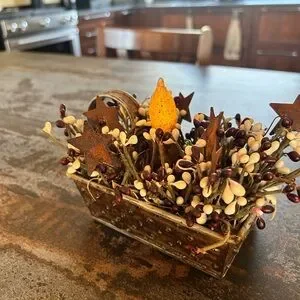 🛍 Bundle 3+ items & save 20%! Primitive cheese grater candle holder with a dark, grubby candle that lights with a twist, farmhouse finish. Accented with rich burgundy pip berries, cream & pepper berries, and rusty metal stars for an authentic primitive look. Approximately 5” x 5”.