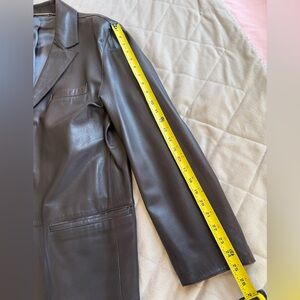 Sophisticated dark brown leather blazer. Sleek design with button closure. Ideal for formal occasions. Lightly use.