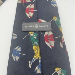 A Robert Talbott necktie with a classic golf theme pattern. The tie features golfers in action with colorful umbrellas scattered across a navy blue background. The design incorporates yellow, green, and red accents.