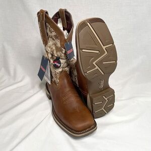 This is the men’s 12” western Dusty Brown/Desert Camo Rebel. This style has a full-grain leather vamp, fox, collar and pull straps with a 900-denier nylon desert camo shaft. A cool new feature that was added to this style is a removable brass bottle opener located in the pull-tab. Inside the boot is a soft mesh lining and the Durango® X-Pand System™ which is a hidden gore expansion on the inside medial seam for a universal fit and easy on/off.