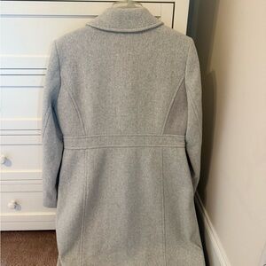 Elegant light gray trench coat by J. Crew. Features a classic design. Ideal for layering in cooler weather. Worn once and in great condition!
