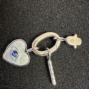 Alex and Ani Protection Trio Interchangeable Charm Bracelet features an evil eye, believed to ward off negativity, embellished with a blue glass crystal on a genuine mother of pearl heart charm; a protective hamsa hand; and a clear crystal accent charm on a silver stainless steel link chain.