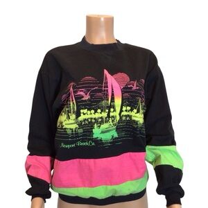 Authentic Diport USA vintage sweatshirt with bold 80’s neon coastal vibes and classic puff paint graphic. Features bright pink and green color-block stripes with a sailboat/Newport Beach–style scene. Relaxed, boxy vintage fit—perfect with your favorite jeans.