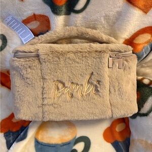 Soft plush bag with Bambi face. Features tan fur and cute ears. Perfect for little make up bag or travel bag for toiletries