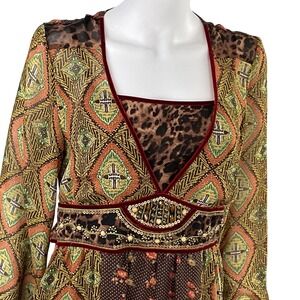 A vibrant Double D Ranch midi dress showcasing a bohemian aesthetic. This unique piece features a striking combination of geometric patterns, animal print, and floral motifs, accented with rich velvet trim and intricate beaded embellishments along the waist. The long sleeves and flowing skirt create an elegant silhouette perfect for a special dinner or a stylish evening out.