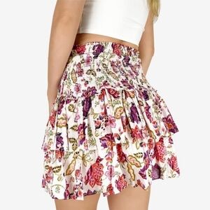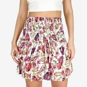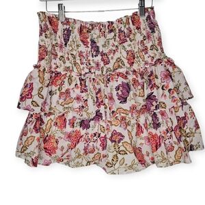 Boho floral mini skirt from House of Harlow 1960 featuring a smocked elastic waistband and tiered ruffle hem. Lightweight woven fabric with a vibrant multicolor floral print. Small stain on front (blends into pattern).