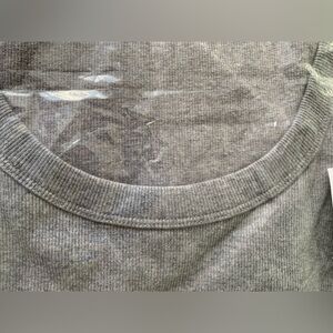 Round neck, ribbed T-shirt. It’s a T you can wear with style, fitted, not sloppy. Looks great with a skirt and sandals in summer or great for layering in winter