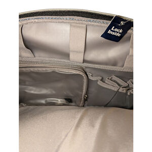 Great condition...deep teal color..pics do not do justice! Rolls great ,tag still attach, lock is included.