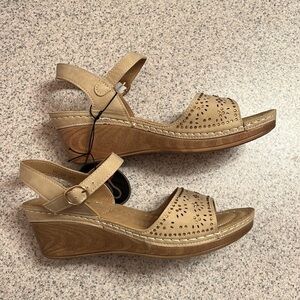 Brand new with tags comfortable sandals with rhinestone deign and ankle strap. 2 1/2 in heel