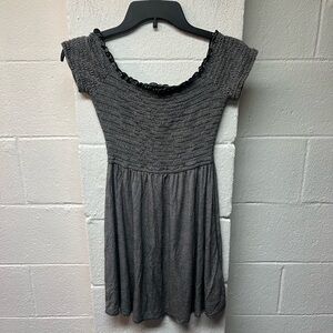Stylish gray mini dress with textured knit top. Features a scoop neckline and short sleeves. Perfect for casual wear.