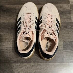 Classic Adidas Gazelle sneakers in cream with black stripes. Comfortable and stylish for everyday wear. Worn maybe 3 times. Can fit an 8.5 but are size 8.