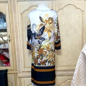 Gorgeous. Hi low design dress with three-quarter sleeves can be belted or non-belted crew neckline with a beautiful regal print and gold and black and brown. Size medium 100% polyester
