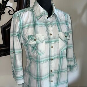 Carhartt Women’s Heron Green White Plaid 3/4 Sleeves Button Down Blouse in Size: M 8/10, 2 pockets, Roll Up Button Sleeves in EXCELLENT condition!! No holes or stains.