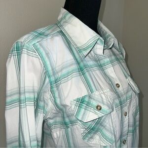 Carhartt Women’s Heron Green White Plaid 3/4 Sleeves Button Down Blouse M 8/10