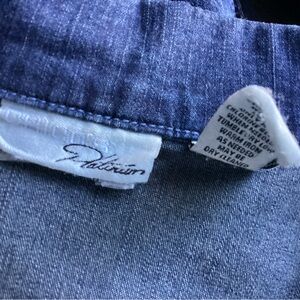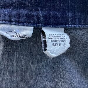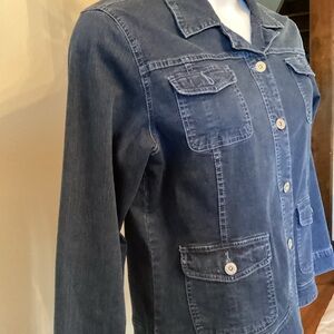 Chico’s Platinum line dark blue denim jacket with bottom front closure, princess seaming, pockets and a curved hemline. Chico’s size 2 comparable to a woman’s size large. Excellent condition.