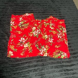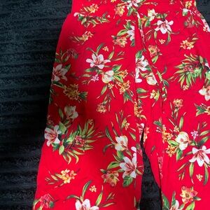Bright red pants with a lively floral pattern. Perfect for adding a pop of color. In good condition, really comfy material! Fits looser towards the bottom of the legs. Elastic waistband with a tie.