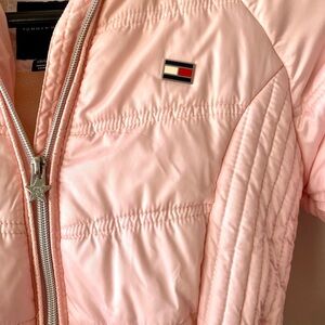 Chic light pink puffer jacket by Tommy Hilfiger. Features a stylish faux fur hood. Ideal for cold weather.