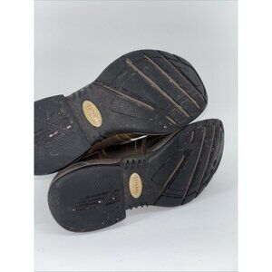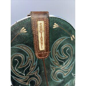 The product is a pair of Shyanne women's size 9.5 brown green leather cowboy stockman boots with a square toe design. These boots feature embroidered accents, a block heel style, and a Western cowboy theme. Made in Mexico, they are crafted from high-quality leather with a durable construction suitable for casual occasions. The boots come in a classic brown color with a unique twist, making them a stylish and versatile addition to any woman's shoe collection.