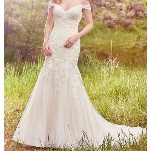 Ivory lace gown with sweetheart neckline. Features elegant off-shoulder sleeves and fitted silhouette. Bridal size 14, equivalent to a street size 10/12. Never worn, purchased from Maggie Sottero sample sale but decided to go with a different dress. Open to reasonable offers!
