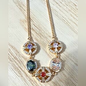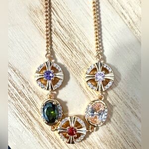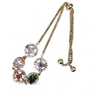 This stunning lariat bracelet features a blend of vibrant gemstones set in a rose gold-plated lariat bracelet design. Perfect for adding a touch of elegance to any outfit.
