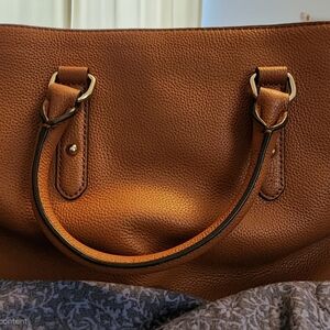 Chic Kate Spade satchel in warm cognac. Crafted from premium pebbled leather. Perfect for stylish outings. Comes with strap.