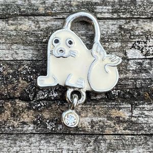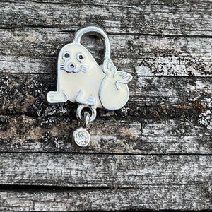 White Harp Seal Charm Pendant Dangle Bezel Set Faux Diamond 1” Long