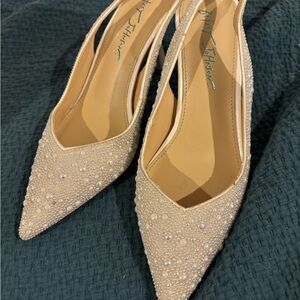 Chic heels adorned with shimmering faux pearls. Perfect for elegant occasions. Wore for my wedding for less than one hour. Only wear is shown in photos (bottoms). Heels are still perfect with no wear.