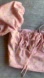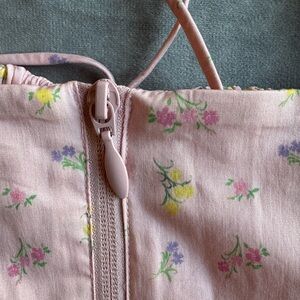 Charming pink top with floral pattern and puff sleeves. Features a tie front detail. Excellent condition!