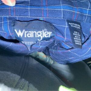 Navy checkered shirt by Wrangler. Features button-up front and dual chest This is a Western style shirt with the classic snap buttons.