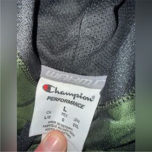 Champion hoodie with green camouflage pattern. Features breathable fabric. Champion Camouflage Performance Duofold Pullover Size Large gently worn with no defects.