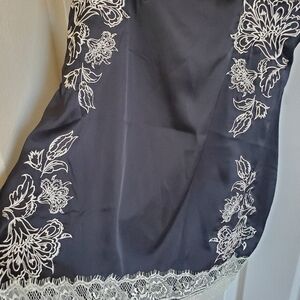 Chic and sexy satin mini from Dolls Kill. Smooth black with ivory color trim. Dress features bust darts, adjustable shoulder straps, invisible side zipper, embroidered front and back, matching eyelash lace on top & hemline.