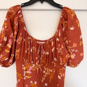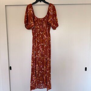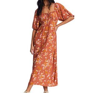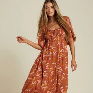 Billabong True Romance Printed Midi Dress in rust / burned orange / sweet chocolate / Tan orangish brown with white, pink and yellow flowers