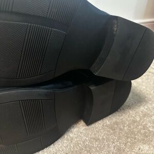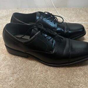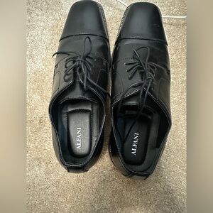 Alfani Adam black oxford dress shoes in men’s size 12M. Classic square toe design with a cap-toe front, lace-up closure, and sleek polished synthetic upper. Cushioned insole for comfort and a durable rubber outsole with minimal wear. Light creasing and a few small marks on the uppers as shown, overall in very good pre-owned condition. Please note colors may appear slightly different in photos due to lighting and other factors.