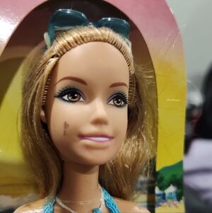 Barbie doll in a mermaid-themed outfit. Features blue and pink details.