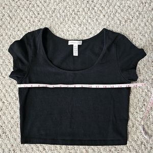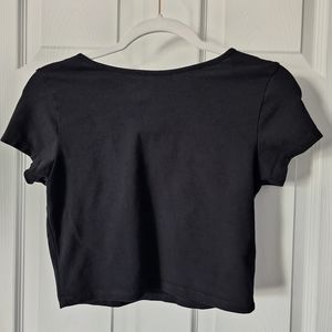 - Black top is a full cropped tee with a relaxed fit.
