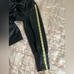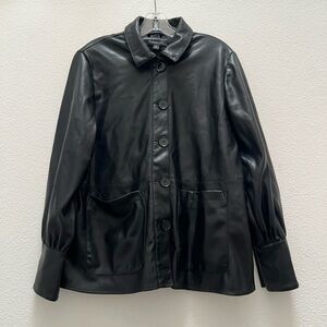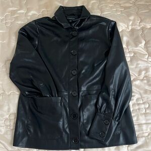 Chic black leather jacket with button closure, perfect for causal wear or office meetings. Features large front pockets and a classic collar. Add this to your fall and winter wardrobe for an effortless, elegant dressing. Wore a few times. She is in great condition, no holes, no scratches. Faux leather is light and super soft, feels like lamb skin without the high maintenance.