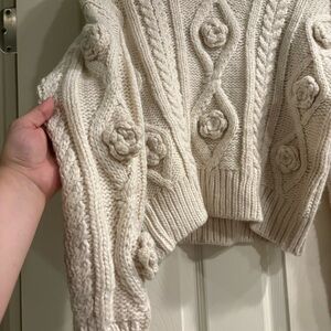 Comfortable and cozy chunky cable knit sweater from Truth by Republic. Has knit rose embellishments on the bodice and sleeves. Turtleneck and long sleeves are perfect for fall / winter and the cropped length is great for layering while keeping a stylish silhouette. Wool, acrylic and nylon blend fabric. No tag size, measures like an XL.