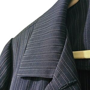 Check out this showstopping dressbarn Navy Pin Stripe Suit Jacket! This sophisticated blazer makes a great addition to any wardrobe for office attire, a business formal event, and even interviews! The fabric features high quality detailing and textures between the pinstripes that match the light purple cuffed sleeves. Don't miss out on looking like a corporate executive with this piece!