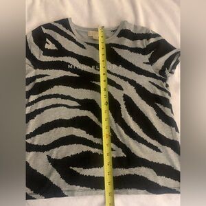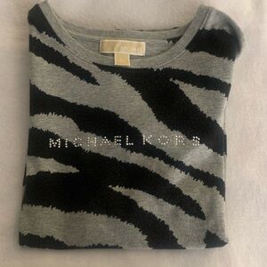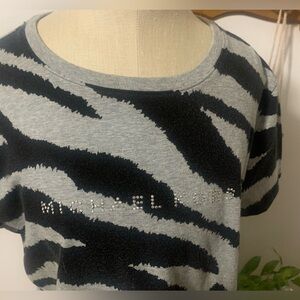 This is a super cute short sleeve T-shirt by Michael Kors in a black and grey zebra print. Shirt says Michael Kors across the chest in silver studs and is a gently used condition with flat measurements in photos. Nice cozy designer tshirt thats 95% cotton, 5% spandex and machine washable.